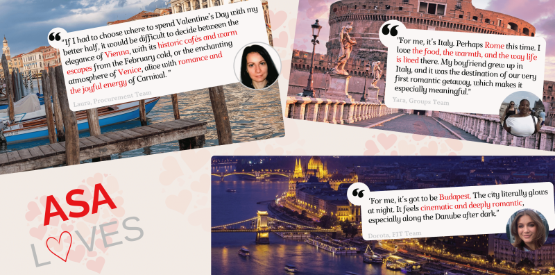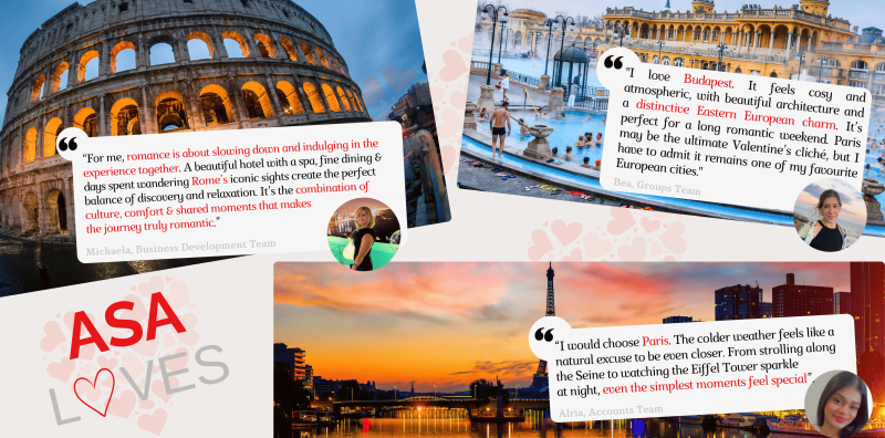 Because romance is often found in the details, we asked some of our team to share the places where love quietly lingers. From spa hotels in Rome to glowing nights along the Danube and wintry walks in Paris, the ASA team reveals their own quiet romantic favourites – where atmosphere, memories, and small shared moments matter most.